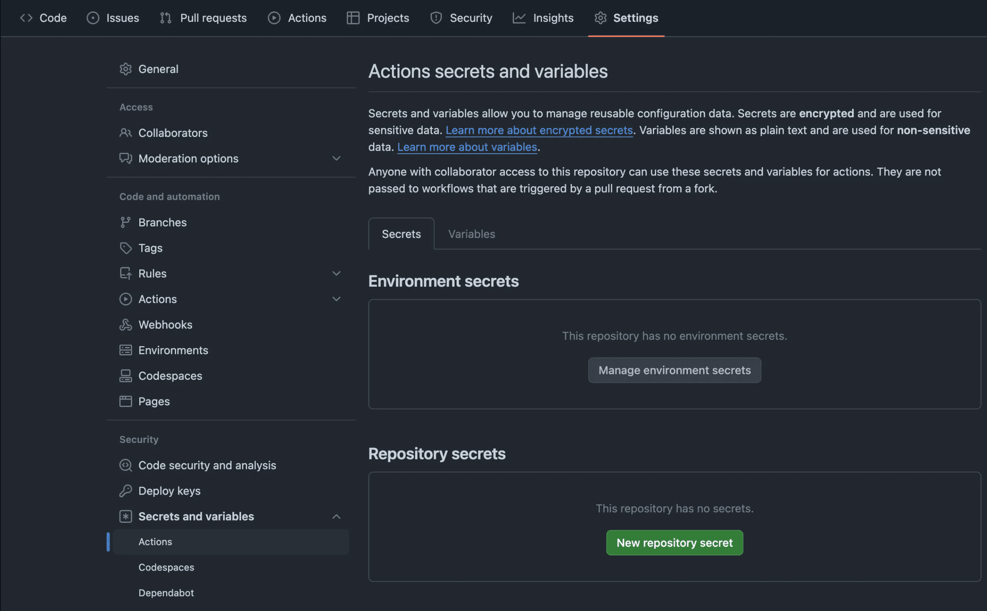 First, let's add all the required environment variables obtained in the AWS steps above to your GitHub repo as repository Secrets. Go to your GitHub repository's Settings, and click on Secrets and Variables. Then, click on New repository secret.